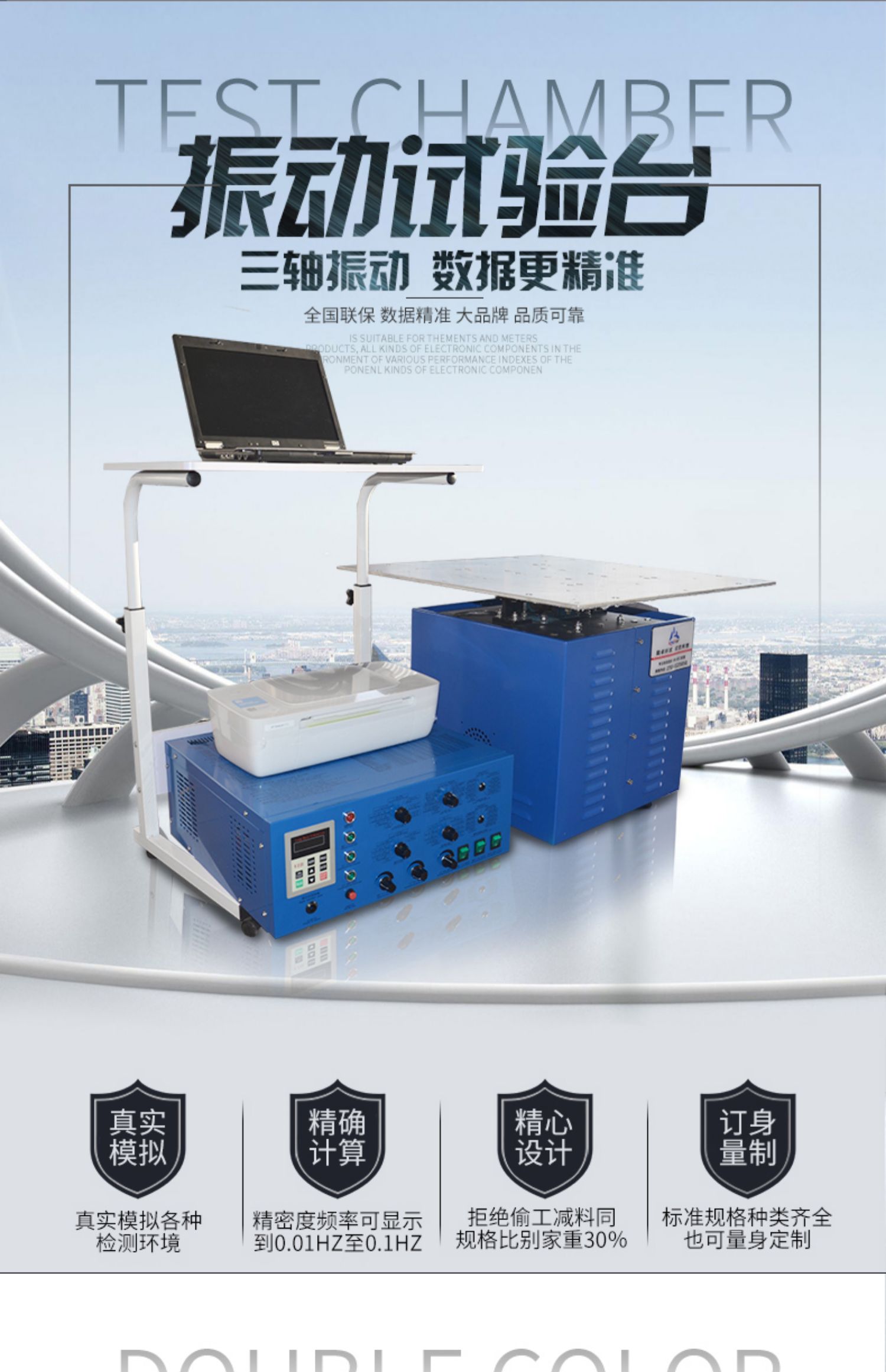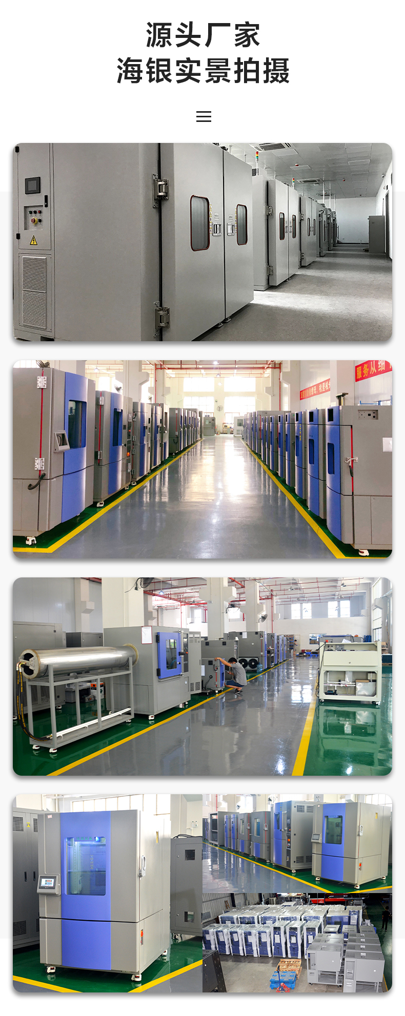 公司长期从事高低温试验箱,可程式恒温恒湿试验箱,冷热冲击试验箱,复层实环境老化试验箱,步入式高低温湿热试验箱,盐雾试验箱,紫外线加速老化试验机,振动试验台,跌落试验机,IP等级淋雨试验箱,IP等级沙尘试验箱,氙灯老化试验箱等可靠性测试设备的研发和生产。