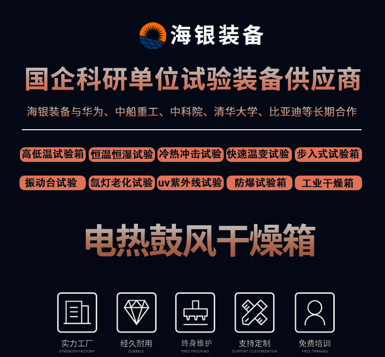 公司长期从事高低温试验箱,可程式恒温恒湿试验箱,冷热冲击试验箱,复层实环境老化试验箱,步入式高低温湿热试验箱,盐雾试验箱,紫外线加速老化试验机,振动试验台,跌落试验机,IP等级淋雨试验箱,IP等级沙尘试验箱,氙灯老化试验箱等可靠性测试设备的研发和生产。